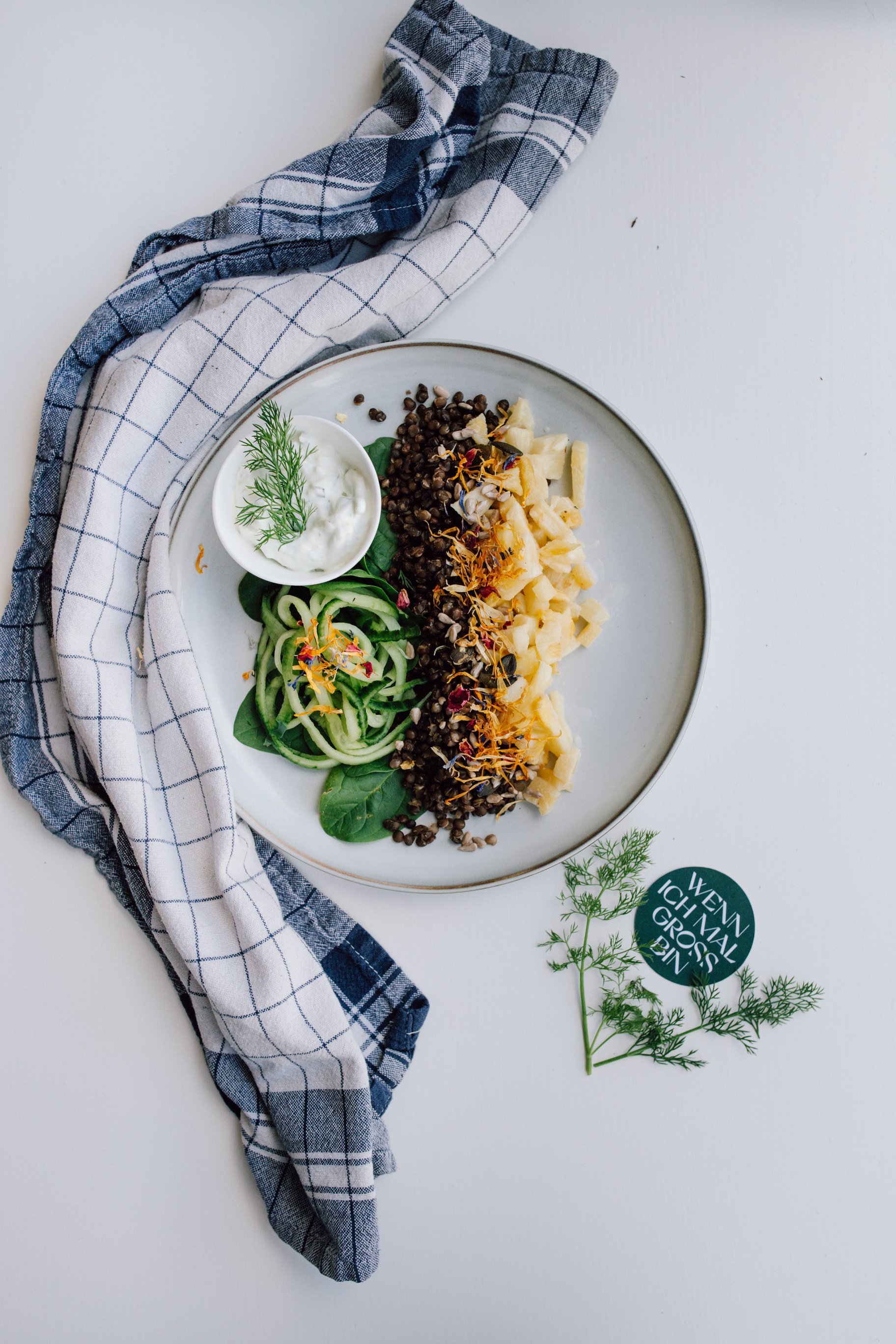 Die gekochten Belugalinsen würzen und in zwei Schalen aufteilen.
